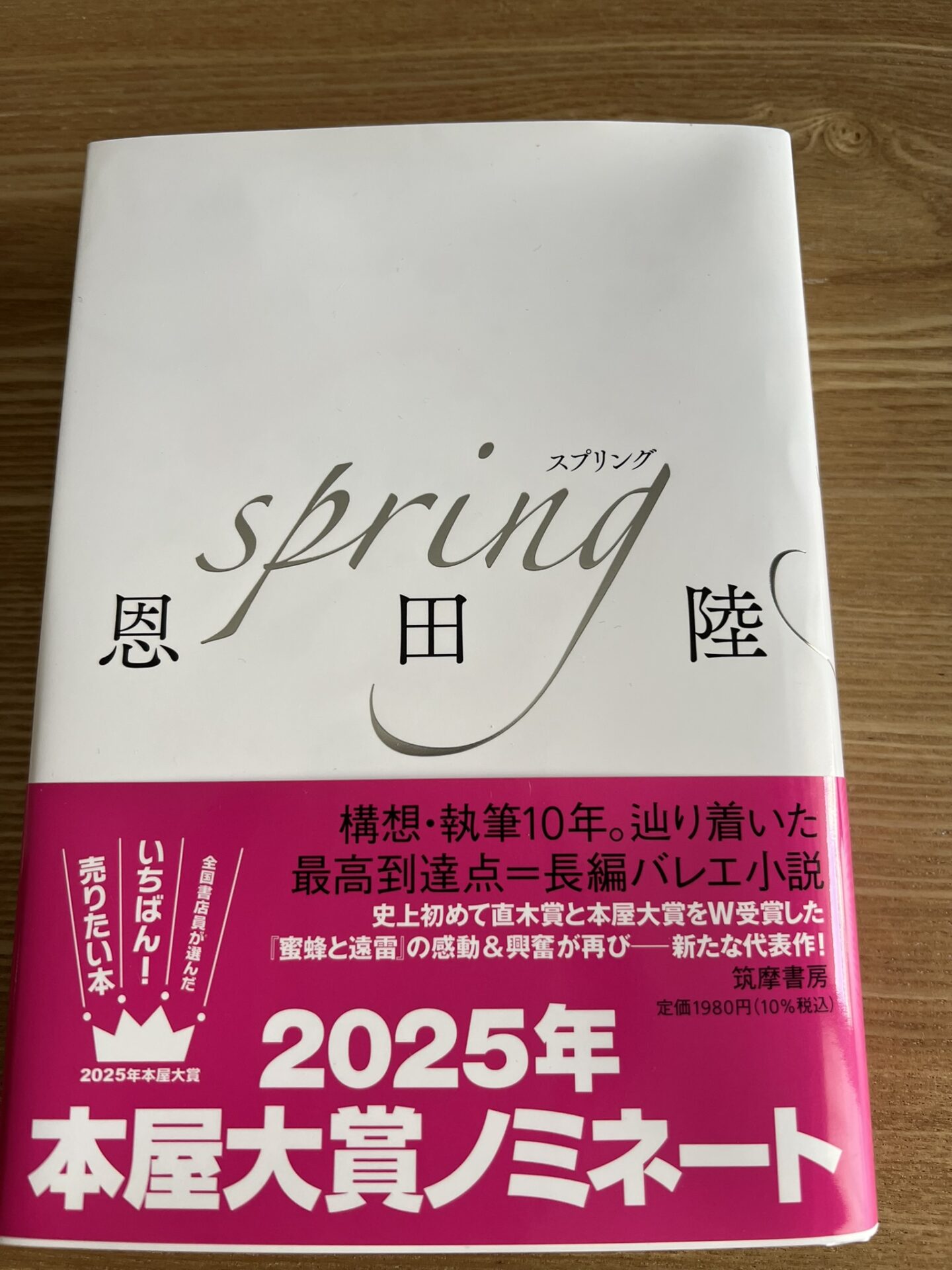 届きました! 趣味 X Facebook LINE コピー 2025.11.15 圧迫骨折中の私、安静中の暇にネットで本を発注!! 今日届きましたー👏 実は「恩田 陸」さんは4冊目です。 特に音楽好きな私は「蜜蜂と遠雷」 何度も読みこみました。 まるでその音楽が文字から聞こえてきそうな緊張と興奮!素敵です。 今読んでいる本もネットで購入したのですがあと少しで読み終わります。 安静中の私、本屋さんに出向けず、今回もネットで本屋大賞から選びました。 「spring・スプリング」 踊るバレーのお話、楽しみです !(^^)!