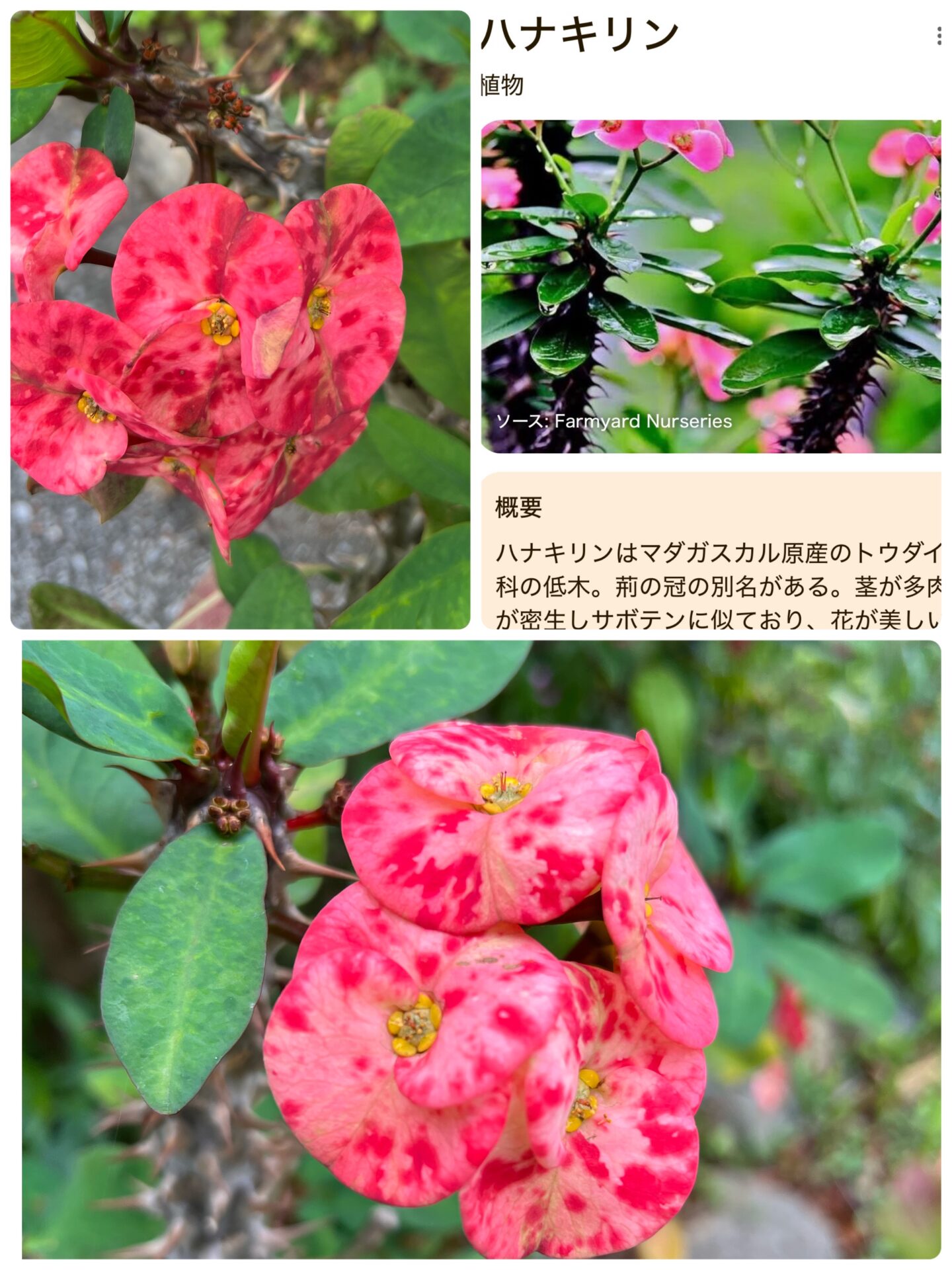 道端ですが珍しい!! 生活 X Facebook LINE コピー 2026.04.06 マダガスカル原産の「 ハナキリン 」 ご存知の方は 寒さに弱いのですが 植木鉢で花を愛でておられそうです😃💞 茎には鋭い棘がありますが、花びらはハート型で美しい色合いを見せてくれます 道端に咲く花。 沖縄に来てからは どの道も新潟では見られない植物が多くあり いつも写真に収めてしまいます。